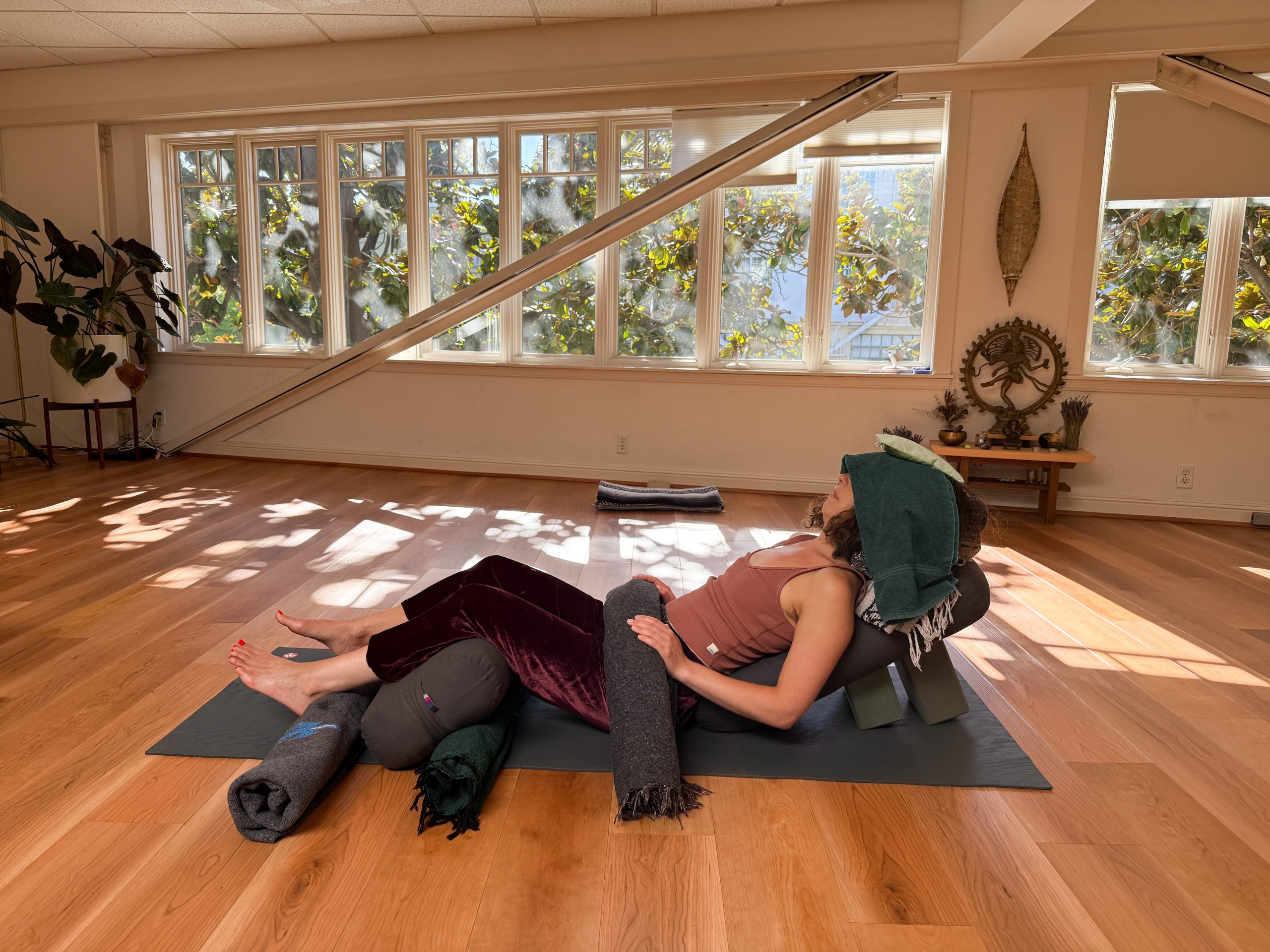My restorative yoga classes include education and practices to support rest and nervous system health. Expect gentle movement and longer-held poses (5-15 minutes) with lots of props for support. During longer pauses in fully supported poses, the body can deeply relax as the parasympathetic nervous system is stimulated.